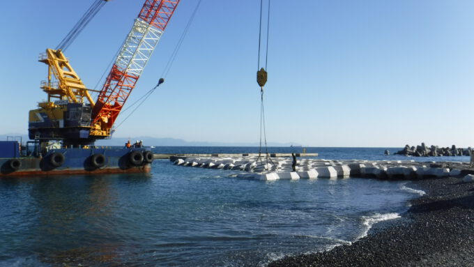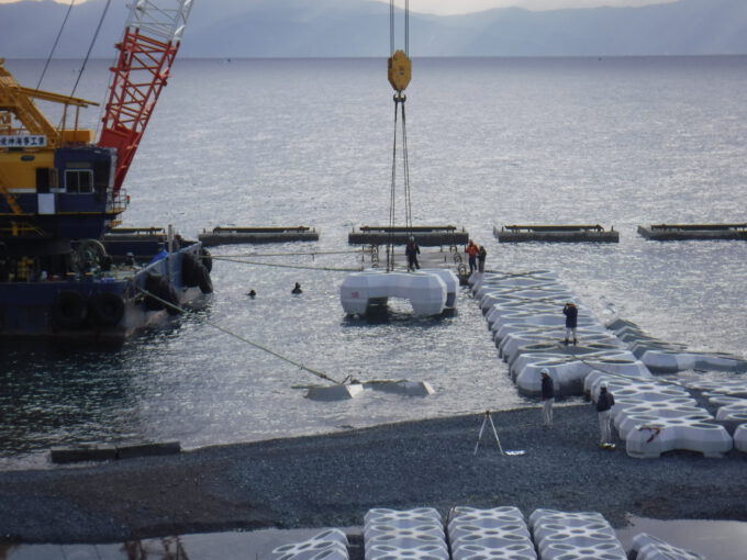 (2018/1/20)本日、大型起重機船による接続堤の設置作業が終了しました。設置にあわせて、静岡土木事務所が主催する見学会を開催し、親子連れや高校生が参加してくれました。
